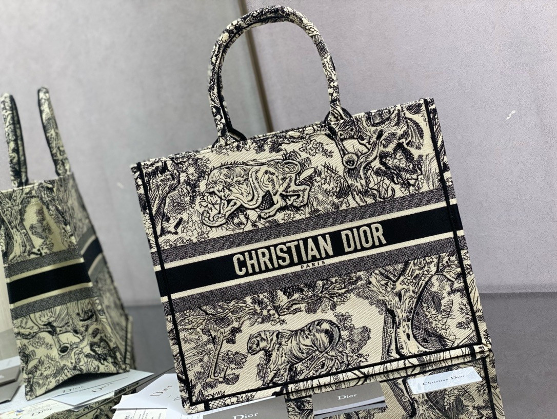LARGE D*0r BOOK TOTE Ecru and Blue Toile de Jouy Embroidery 16.5 x 14 x 7.5 inches